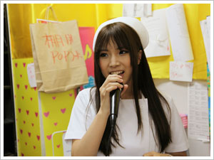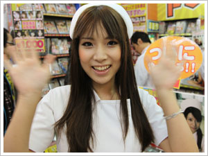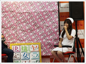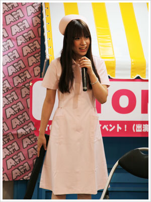 | 第1部は信長書店日本橋店さん! ここ大阪でも「絶対に感じてはいけない病院24時間」の ナース服で颯爽と登場!もちろん手には…! |